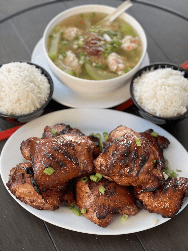 When I was a kid, one of my favorite chicken dishes my mom made was gà nước mắm, tiêu, đường. Literally translated to chicken with fish sauce, pepper, and sugar. Mom pan-fried the chicken leaving a beautiful fish sauce smell all over the house. The chicken skin crisped up and the meat was juicy and very tender. The fish sauce marinade was salty, sweet, and spicy making every bite extremely enjoyable with tons of flavors going on at the same time. While I was at work one day, I was thinking about it, and miss those flavors so decided to try that marinade for my BBQ chicken.