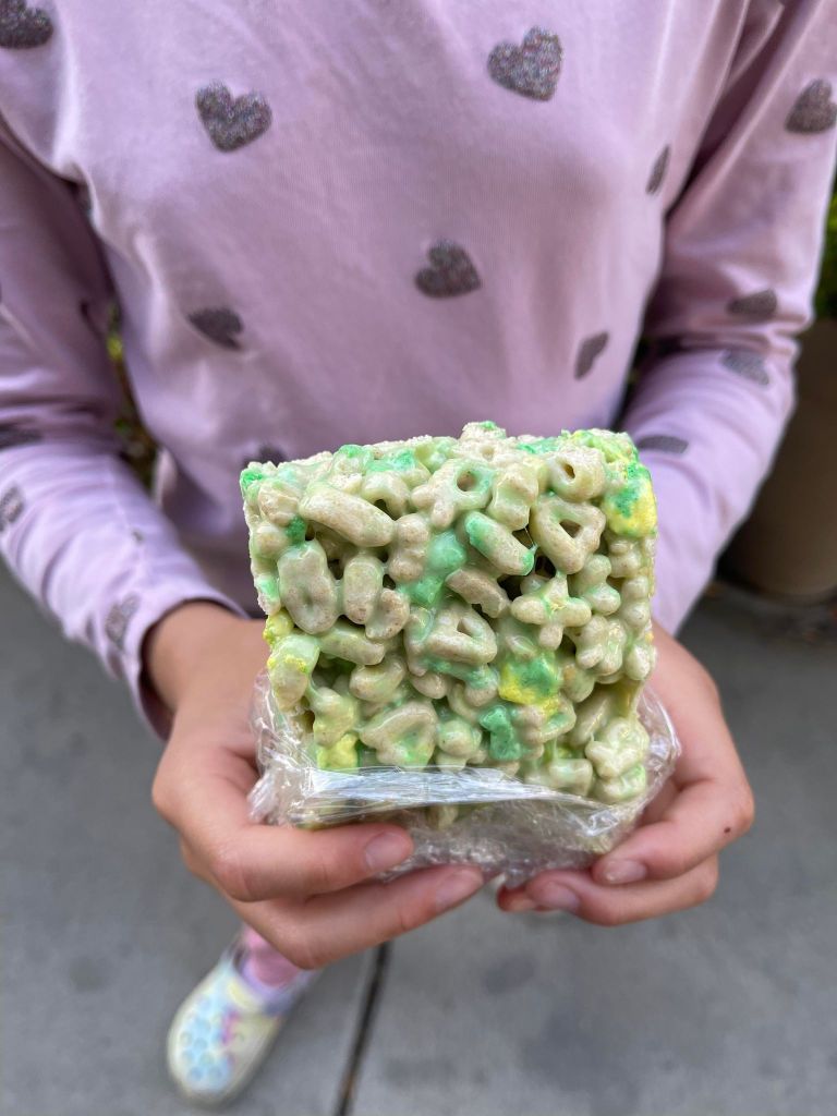 Shape Lucky Charms Treats – Pour the lucky charms treats on a parchment paper lined baking tray and pack it into a large rectangle. Cut them into smaller rectangles and enjoy.